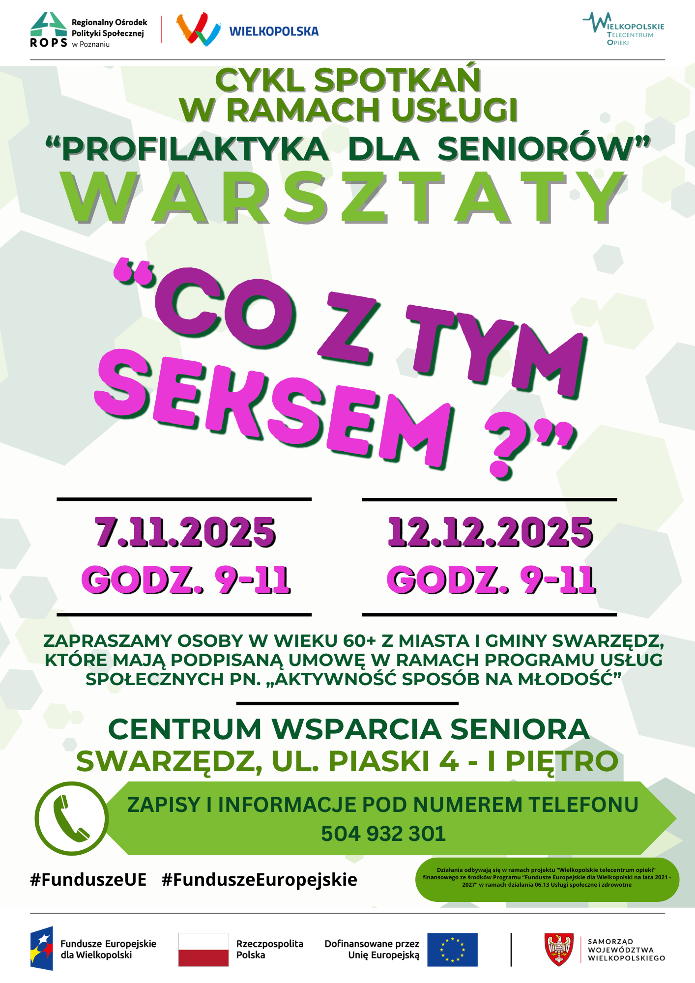 Serdecznie zapraszamy Państwa na warsztaty pod tytułem „Co z tym seksem?” realizowane w ramach cyklu „Profilaktyka dla seniorów”.