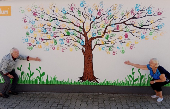 W tym czasie wnętrza budynku Dziennego Domu Pomocy, jak i teren na zewnątrz zmieniły się nie do poznania. W placówce została wyburzona ściana dzieląca dwa pomieszczenia tworząc jedną wielką salę do zajęć i relaksu. W kuchni powstało profesjonalne okienko do wydawania obiadów, co ułatwiło pracę personelu przy dystrybucji posiłków. Natomiast na zewnątrz, na jednej ze ścian frontowych budynku powstał mural przedstawiający drzewo, na którym rosną liście kolorowych wnętrz dłoni. Ma on symbolizować międzypokoleniowe relacje społeczności lokalnej z seniorami. Obraz wykonali uczestnicy dziennych placówek dla seniorów przy ul. Sienkiewicza 21 tj. Dziennego Domu „Senior – WIGOR” oraz Dziennego Domu Pomocy, mieszkańcy bloku, a cała akcja zorganizowana została w ramach wolontariatu pracowniczego firmy Blum, za co bardzo dziękujemy.
