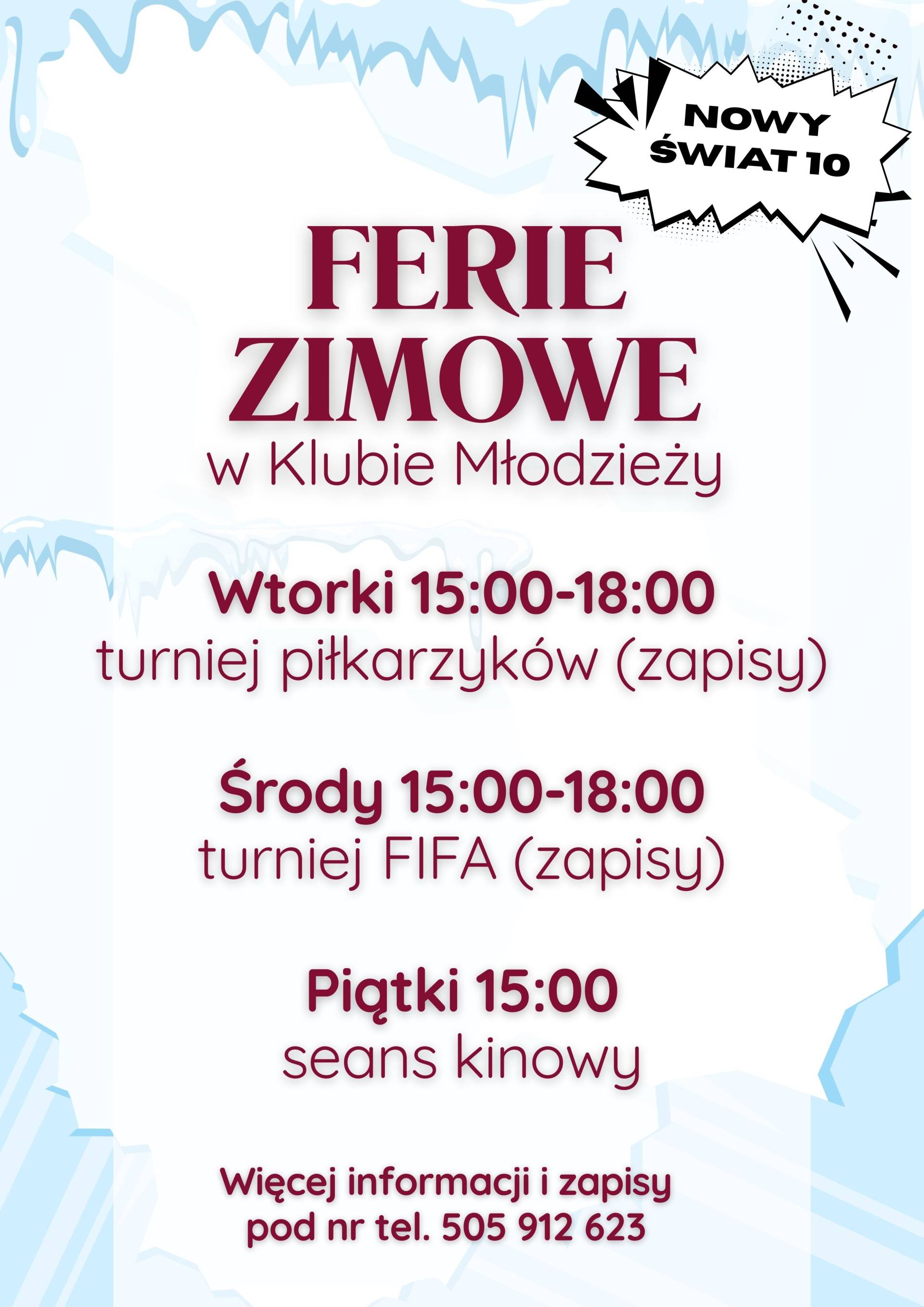 Zmiana godzin otwarcia Klubu Młodzieży NOWY ŚWIAT 10 w dniach 16-26 lutego 2026 roku.