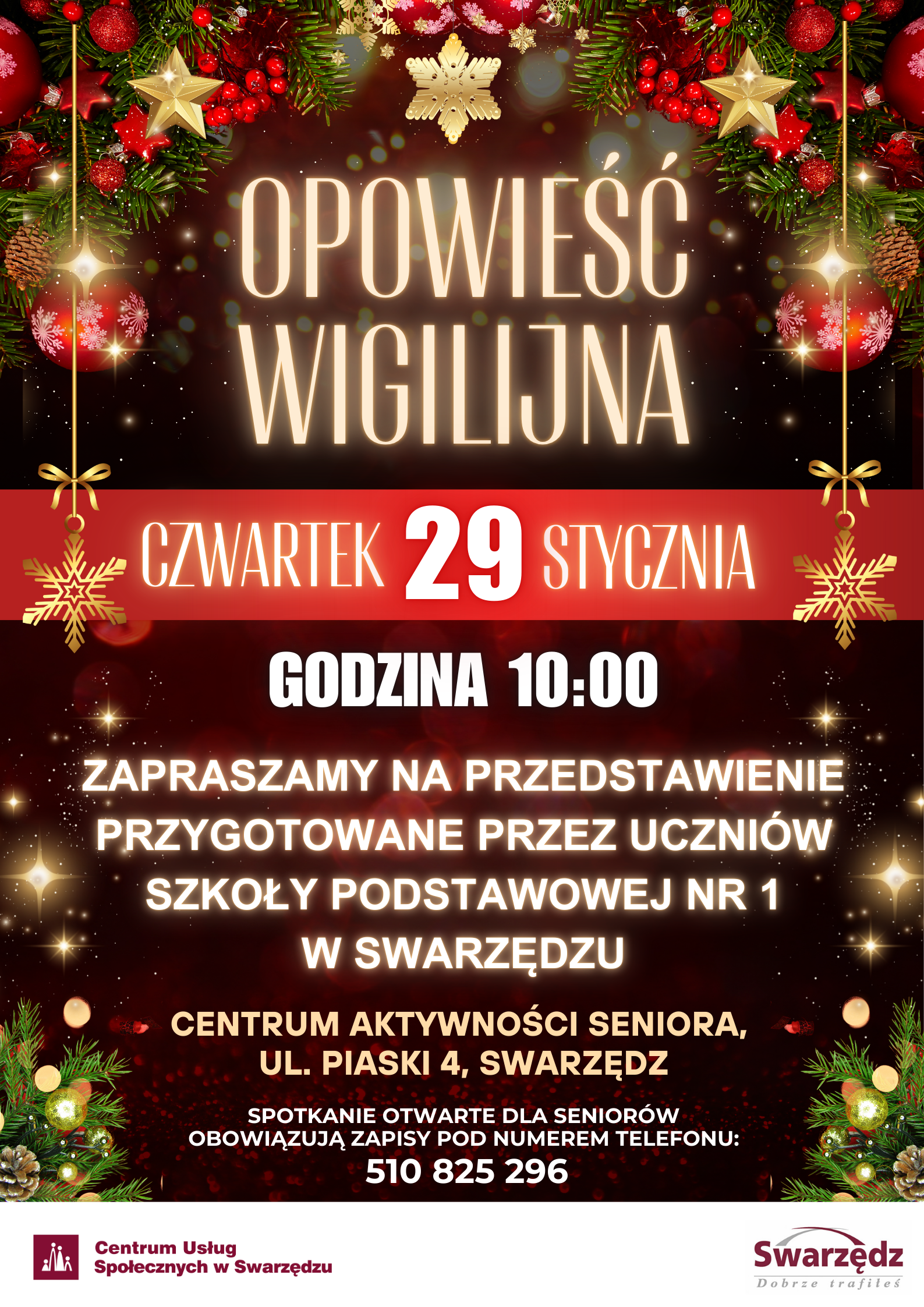 29 stycznia, o godz. 10:00 serdecznie zapraszamy na przedstawienie pt. „Opowieść wigilijna”, przygotowane przez uczniów Szkoły Podstawowej nr 1 w Swarzędzu.