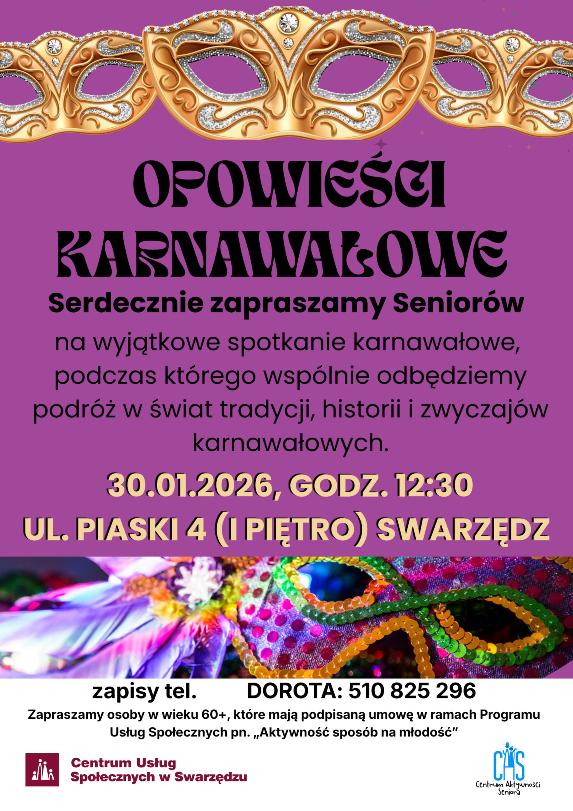 Centrum Aktywności Seniora w Swarzędzu przy ul. Piaski 4 zaprasza do udziału w wydarzeniu pn. „Opowieści karnawałowe”.
