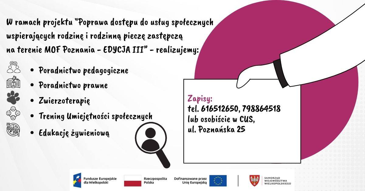 Centrum Usług Społecznych w Swarzędzu realizuje projekt „Poprawa dostępu do usług społecznych wspierających rodzinę i rodzinną pieczę zastępczą na terenie MOF Poznania – EDYCJA III”.