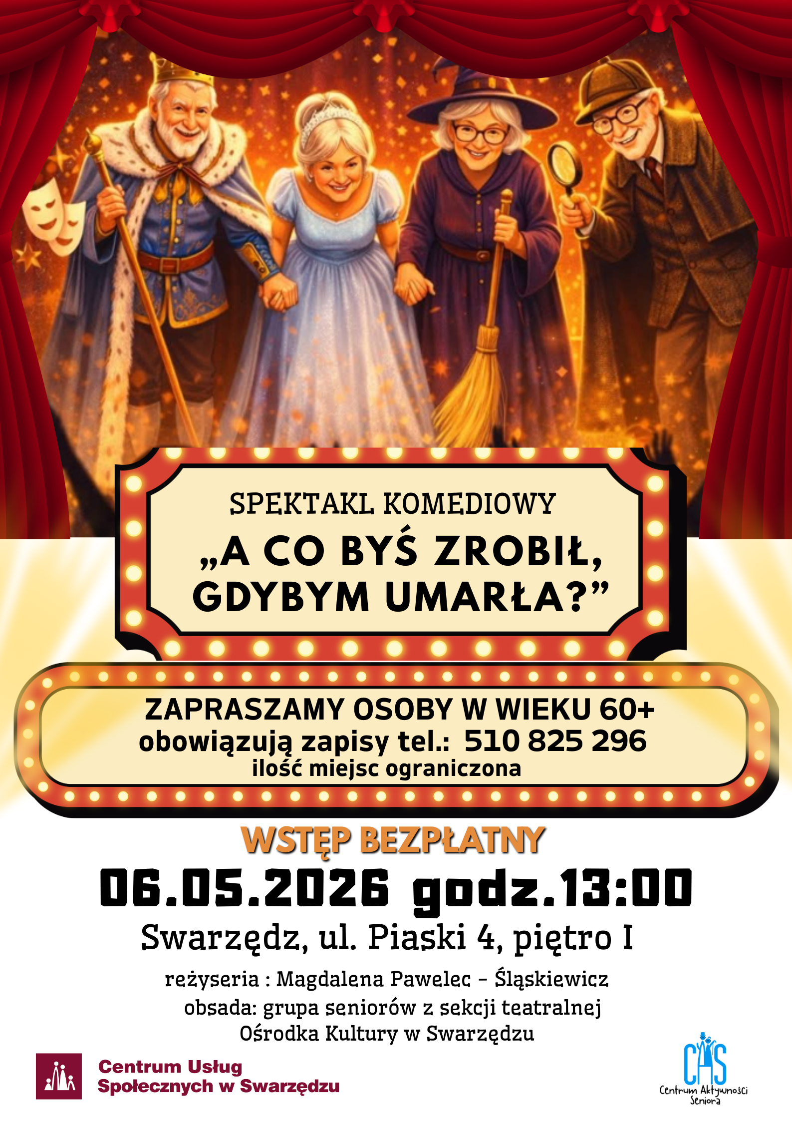 Przedstawienie odbędzie się w środę 6 maja 2026 roku o godzinie 13.00 w Centrum Aktywności Seniora w Swarzędzu przy ulicy Piaski 4, na pierwszym piętrze.