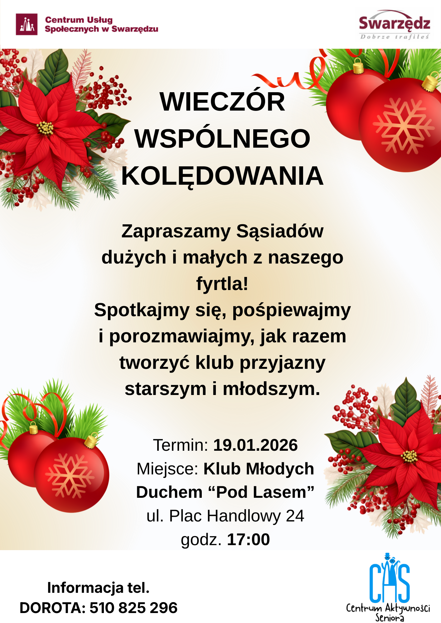 W poniedziałek 19 stycznia 2026 roku o godzinie 17.00 w Klubie Młodych Duchem „Pod Lasem” odbędzie się spotkanie zatytułowane „Wieczór wspólnego kolędowania”.