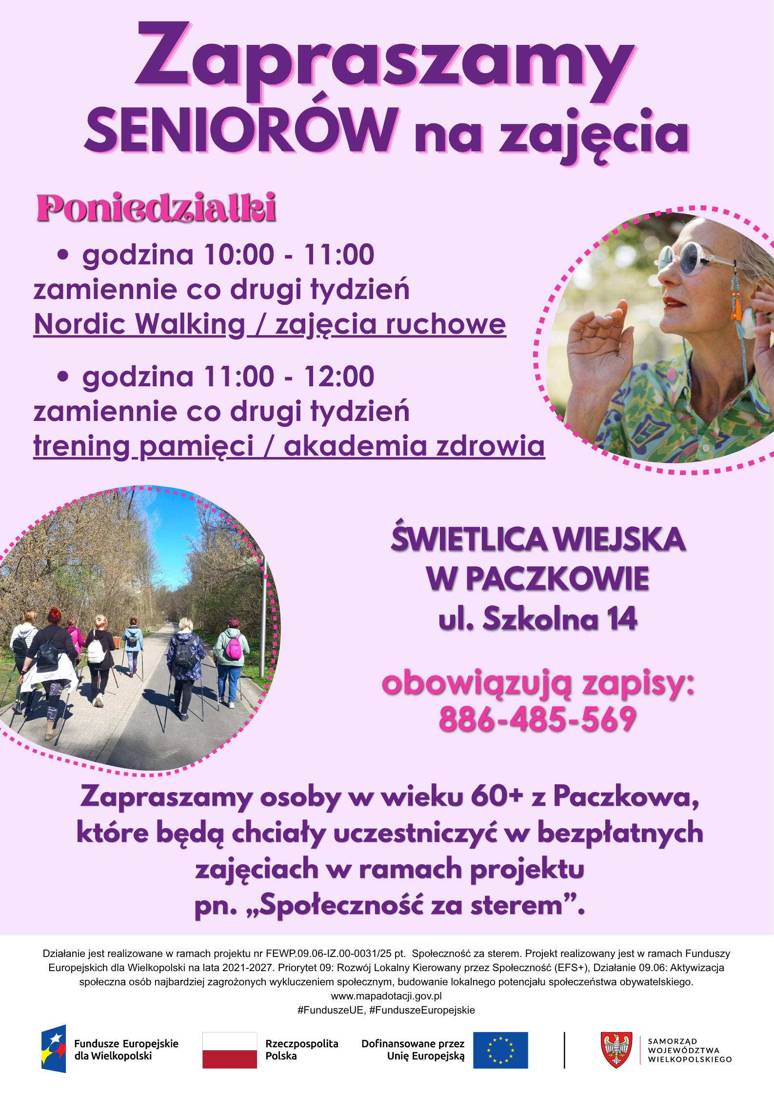 Działanie jest realizowane w ramach projektu nr FEWP.09.06-IZ.00-0031/25 pt. Społeczność za sterem. Projekt realizowany jest w ramach Funduszy Europejskich dla Wielkopolski na lata 2021-2027. Priorytet 09: Rozwój Lokalny Kierowany przez Społeczność (EFS+), Działanie 09.06: Aktywizacja społeczna osób najbardziej zagrożonych wykluczeniem społecznym, budowanie lokalnego potencjału społeczeństwa obywatelskiego.
