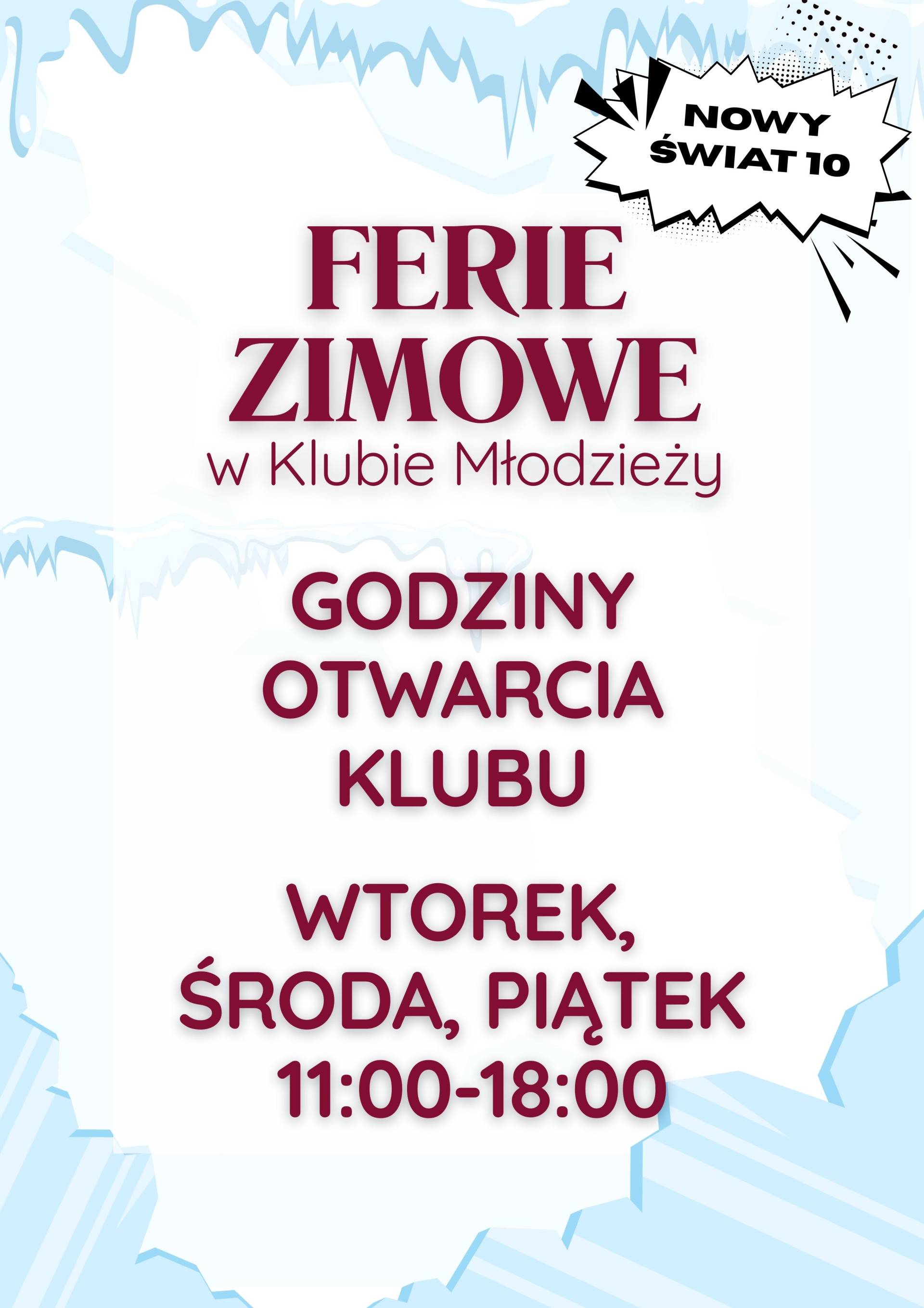Zmiana godzin otwarcia Klubu Młodzieży NOWY ŚWIAT 10 w dniach 16-26 lutego 2026 roku.