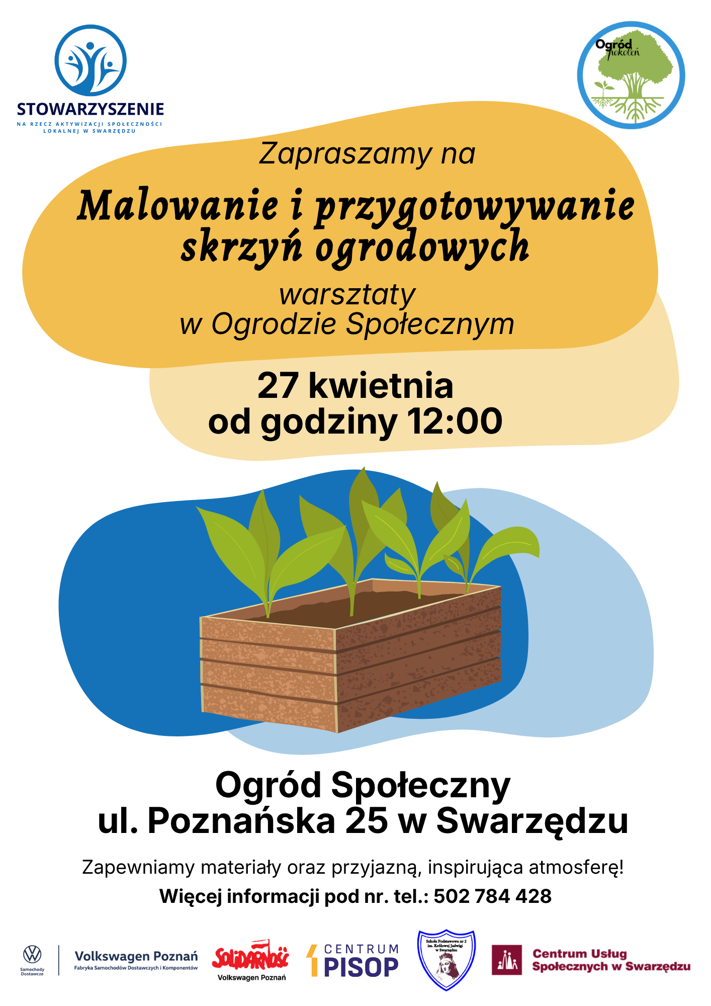 Centrum Usług Społecznych wraz ze Stowarzyszeniem na rzecz Aktywizacji Społeczności Lokalnej w Swarzędzu zapraszają na kolejne warsztaty w ogrodzie społecznym realizowane w ramach projektu „Ogród Pokoleń – Siejemy relacje, zbieramy smaki”. Tym razem będziemy wspólnie malować skrzynie ogrodowe i przygotowywać je do nasadzeń.