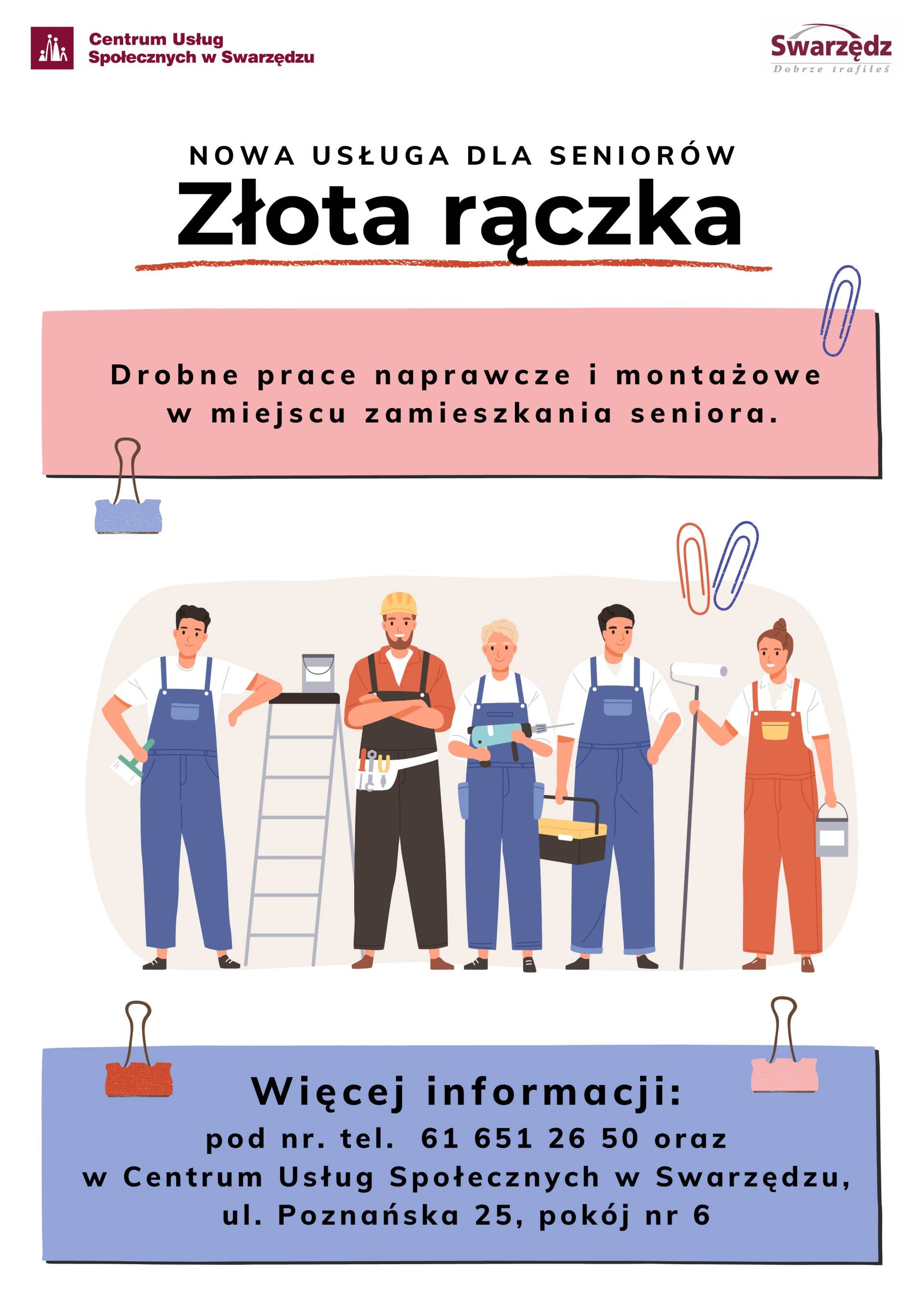 Centrum Usług Społecznych w Swarzędzu informuje o uruchomieniu nowej usługi społecznej pn. „Złota Rączka”, skierowanej do mieszkańców gminy Swarzędz w wieku 60+.