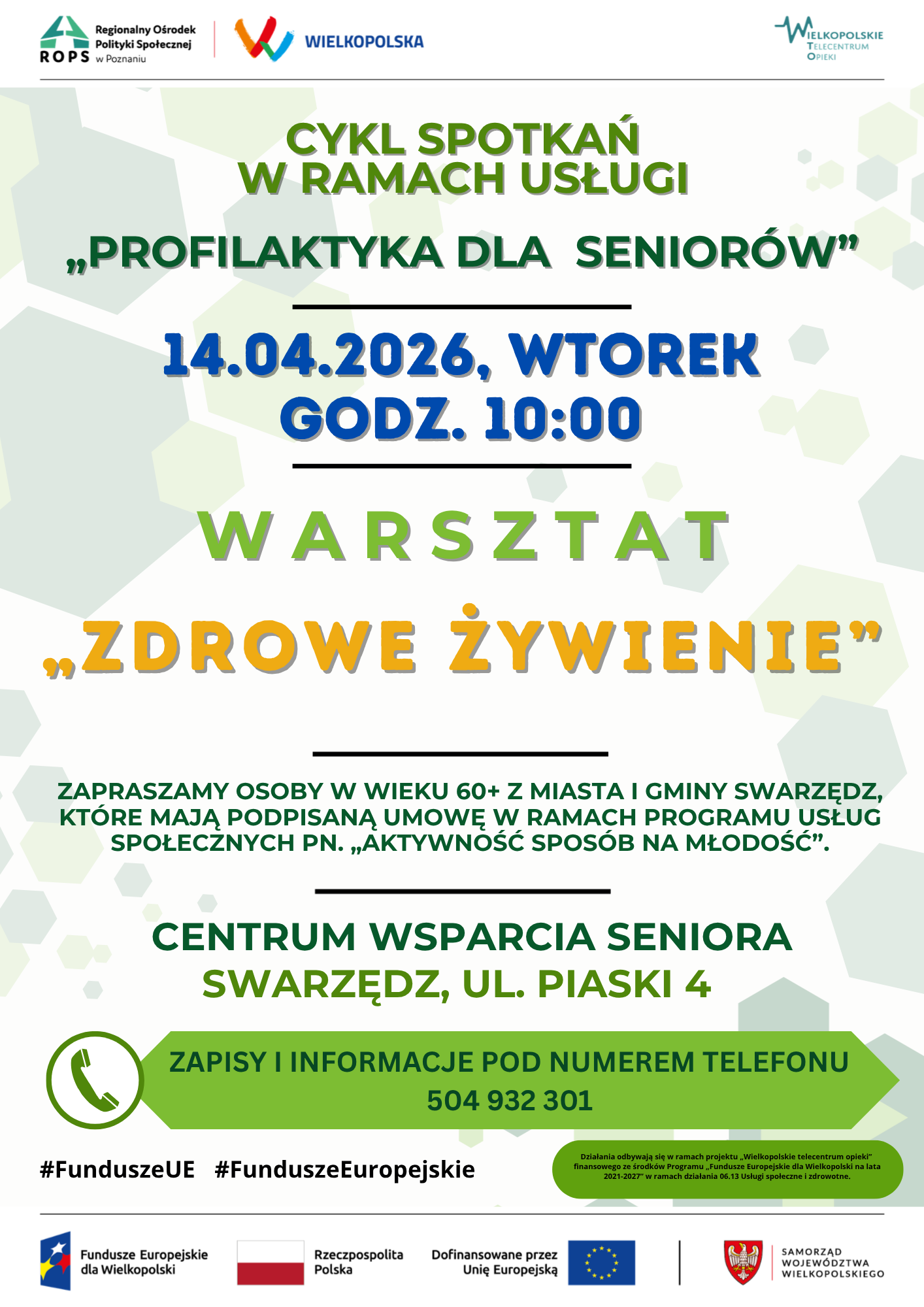 serdecznie zapraszamy na warsztat poświęcony zdrowemu żywieniu. Spotkanie odbędzie się we wtorek 14.04.2026 roku o godz. 10:00 w Centrum Wsparcia Seniora w Swarzędzu przy ulicy Piaski 4.